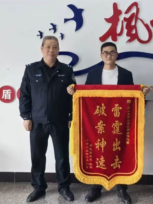“真的太感谢咱们民警了,多亏你们快速破案,帮我及时挽回了损失!”10月8日上午,张先生带着一面印有“雷霆出击、破案神速”字样的锦旗来到弦山派出所,感谢民警快速破获盗窃案件,为其追回被盗物品。